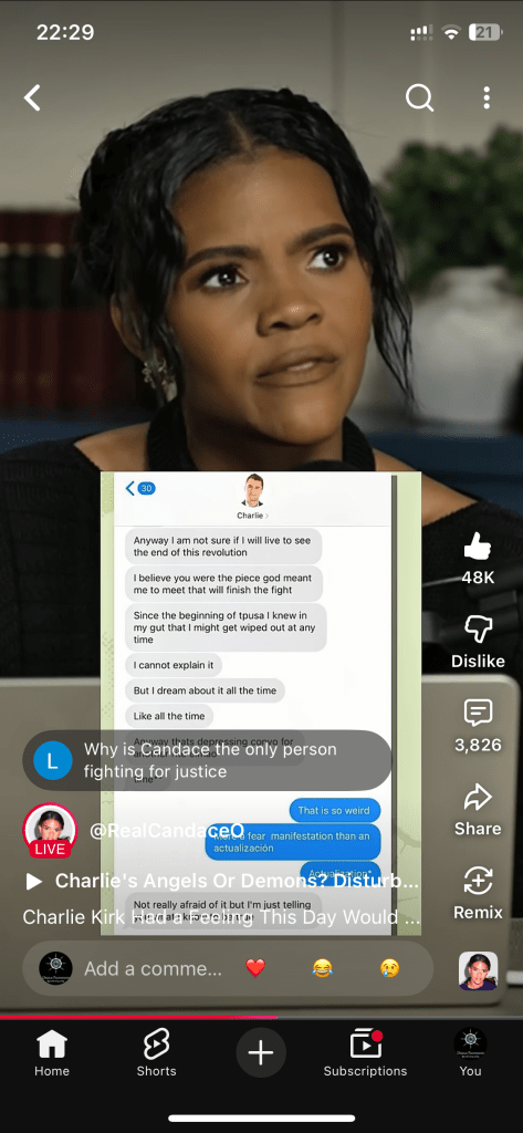 Candace Owens then showed screenshots of a conversation with Charlie Kirk where he said: “If I tell you the true prophecy that I know in my gut. It’s really sad.”
